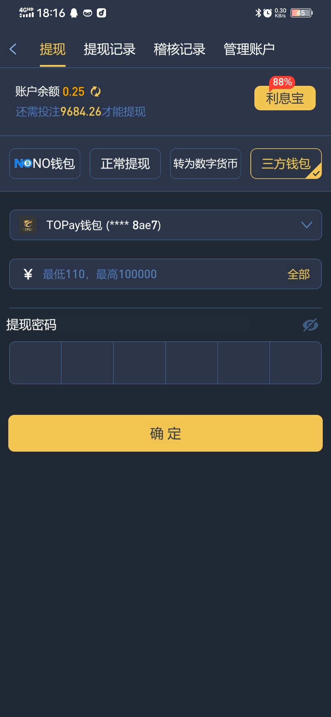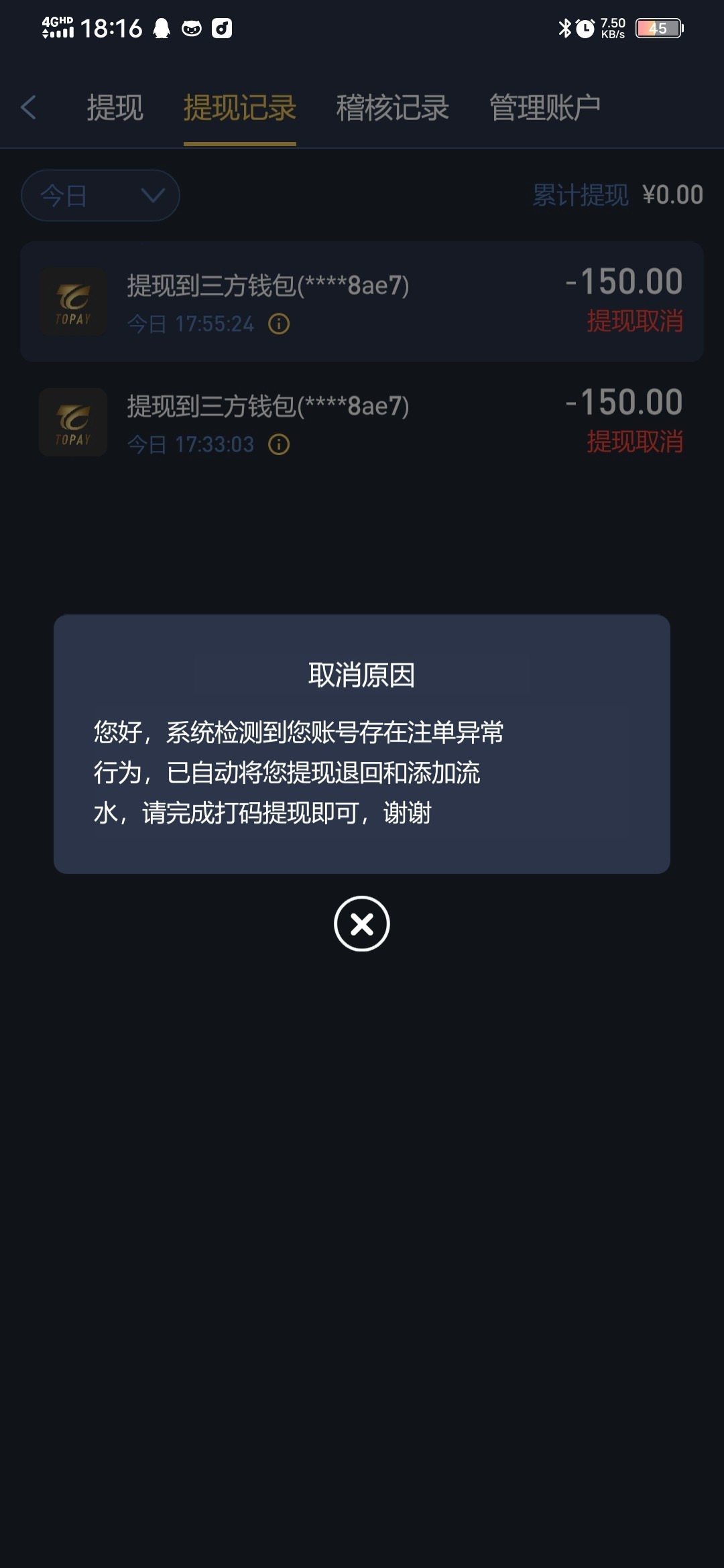 你还好我这边刚刚打了个野鸡台子 送25 下注2000流水 才可以提现103 然后我打了cbd1w流水 才够 说我ip多 不给我出我现在还有1500里面